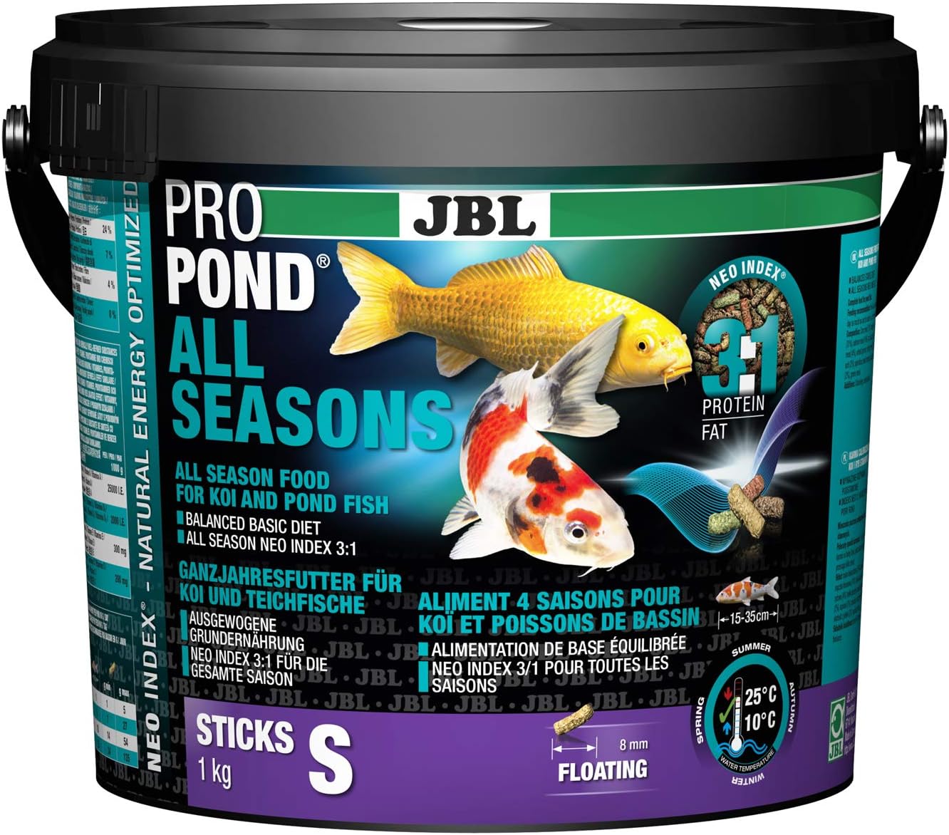 Nourriture standard pour Koïs et poissons de bassin de 15-35 cm, Pour une température de l'eau de 5 à 15 °C de 10-25 °C, Bâtonnets Alimentaires Flottants - Adapté aux besoins particuliers toute l'année: Rapport protéines/lipides 3:1 selon l'indice NEO (Tenir compte de la température de l'eau, Fonction, Taille et âge), Alimentation de base équilibrée - Croissance saine grâce à des protéines de haute qualité, Stockage énergétique élevé par acides gras oméga 3 et 6, Maintien de la couleur par carotènes, Digestion et absorption optimale des minéraux et oligo-éléments par teneur en cendres brutes - Conseils d'alimentation : 1 à 2 fois par jour, En quantité consommable en quelques minutes - Contenu: 1 x JBL 1,0 kg, ProPond All Seasons, Nourriture standard pour Koïs, Bâtonnets Alimentaires Flottants, Taille: S, Refermable, Contenant résistant à l'eau et à l'air