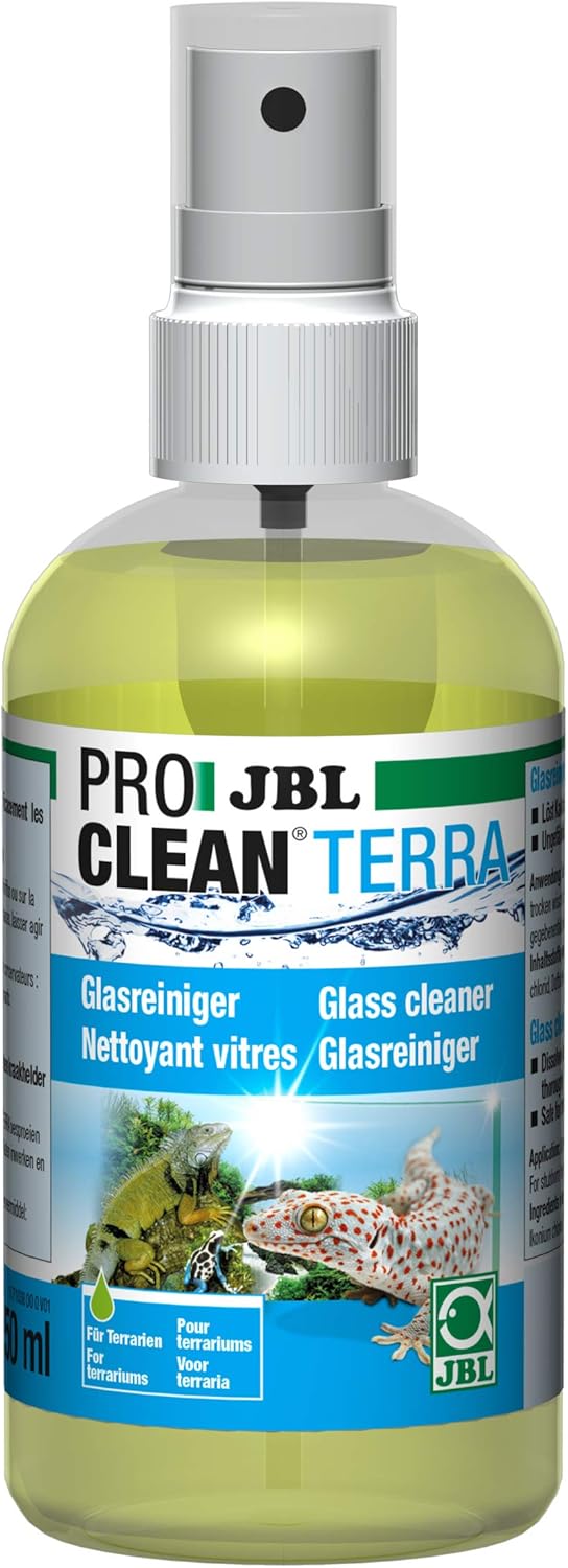 Nettoyant pour vitres de terrariums Propreté des vitres de terrarium - Le JBL ProClean Terra élimine même les dépôts calcaires les plus tenaces de la vitre du terrarium. Ce nettoyant puissant ne présente aucun risque pour les animaux du terrarium et dissout automatiquement les traces de calcaire sur les vitres des terrariums.