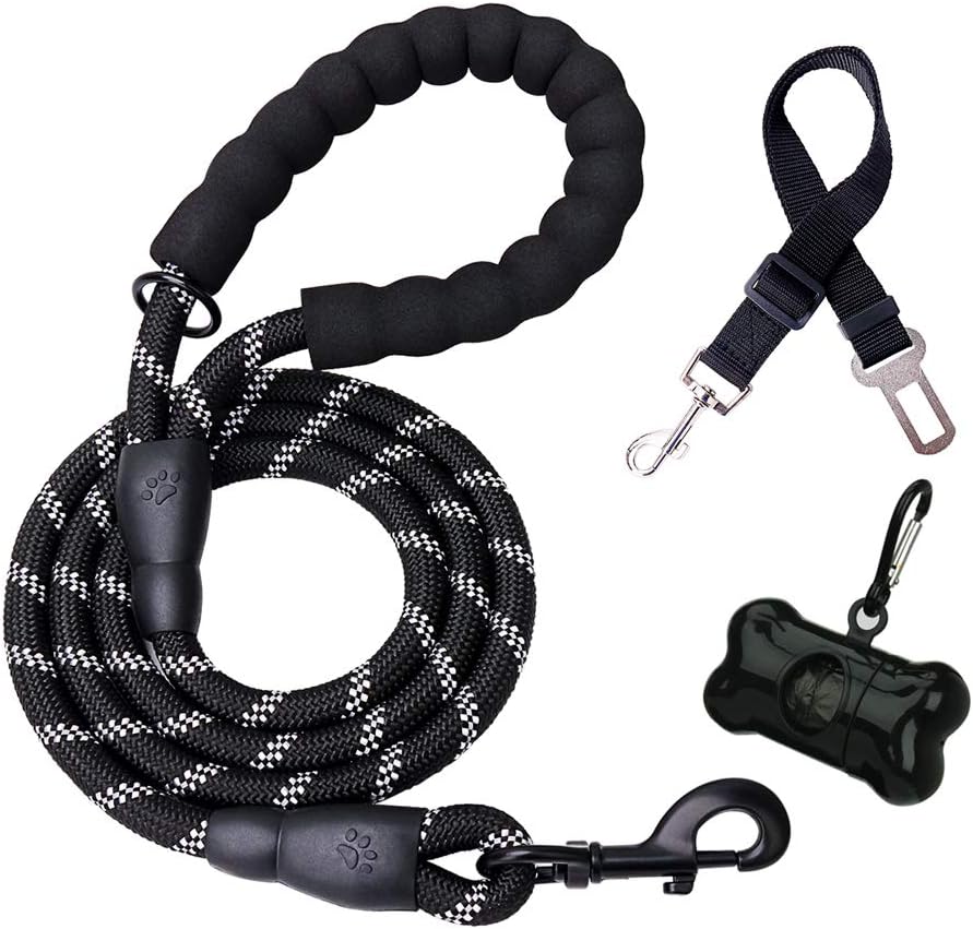 Poignée rembourrée confortable : poignée rembourrée en mousse EVA souple conçue pour une prise en main confortable, protège votre main contre les brûlures de la corde lorsque votre chien tire dur. Un anneau en métal est livré avec la laisse de corde, accroché à la poignée, il est pour distributeur de sacs à déjections canines à clip, bol ou clés.