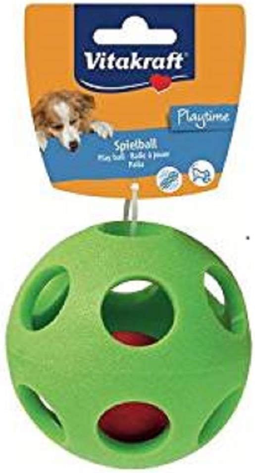 Balle de jeu fun, composée d'une première balle ornée de trous laissant champ libre à l'animal pour apercevoir une seconde balle sonore au sein de la première. Les différences de mobilité des 2 balles fascinent et stimulent les chiens. Sa composition en cahoutchouc pour la première balle et de mousse pour la deuxième plus petite en font un accessoire de jeu imparable. Pour des heures de jeu garanties. Comble l'ennui de l'animal et stimule ses besoins de mouvement et de jeu. Effet sonore incorporé, stimulant le développement de l'attention du chien. Conseils d'utilisation: Pour le bien-être physique et mental de votre chien, stimulez-le régulièrement avec des jouets adaptés. 15 cmVitakraft est sans conteste le leader de l'alimentation, récompenses, friandises, hygiène, soins et accessoires pour animaux de compagnie grce à une philosophie qui repose sur l'amour de la nature et des animaux. La variété, la qualité et l'innovation caractérisent nos produits et ce, pour l'ensemble des animaux de compagnie: chiens, chats, rongeurs, oiseaux, poissons.
