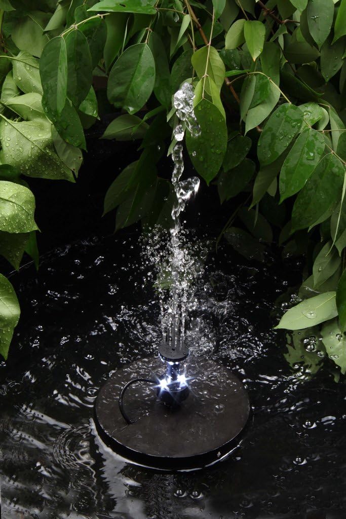 Pompe solaire pour petit bassin. Fontaine alimentée par énergie solaire avec batterie pour fonctionner en absence de soleil, avec illlumination par 2 ampoules LEDs ( qui s'allument automatiquement le soir). Installation possible sous l'eau ou flottante